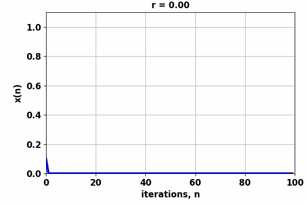 Fig. 3. Population x ( n ) as the growth factor is incremented from 0.6 ...