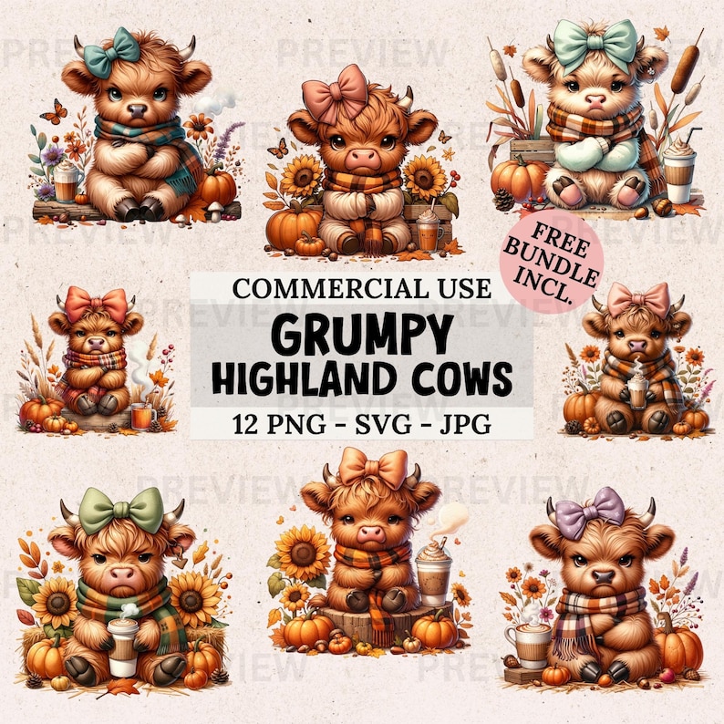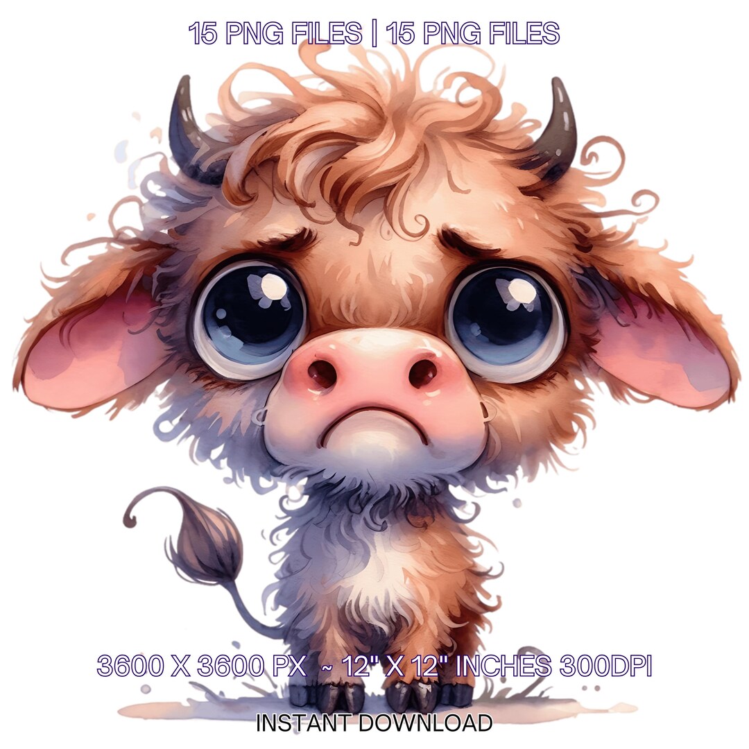 Grumpy Highland Cow Clipart Set, 12 Cute Whimsical Cow Art Images in ...
