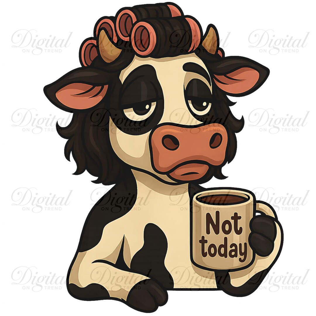 Grumpy Cow PNG, Cute Sleepy Cartoon Cow With Pink Curlers and Coffee ...
