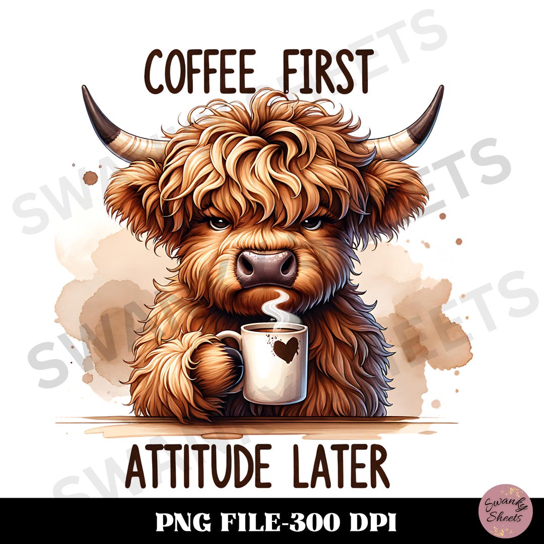 Grumpy Highland Cow PNG, Cranky Coffee Lover Png, Fluffy Cow Grumpy ...