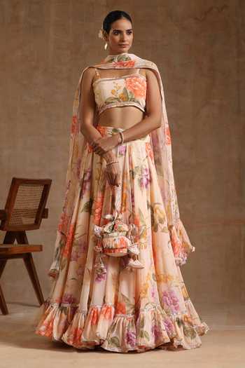 Buy Peach Georgette Floral Square Gul Ruhani Pattern Lehenga Set For ...