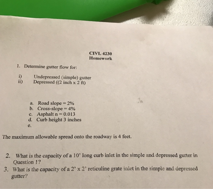 CIVL 4230 Homework 1. Determine gutter flow for: i) | Chegg.com