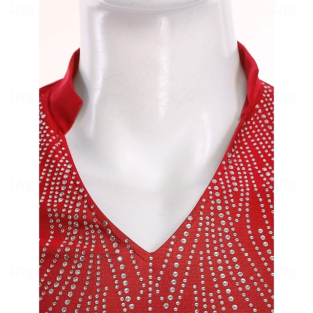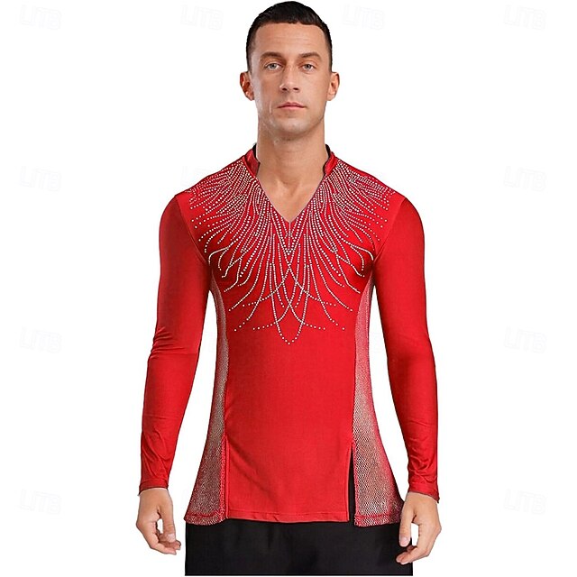 Men's Red Latin Ballroom Dance Shirt - Rhinestone Side Slit Top with ...