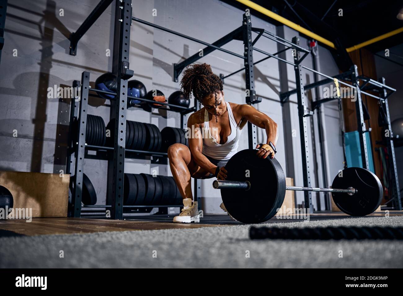 Female weight lifter loading weights onto barbell in gym Stock Photo ...