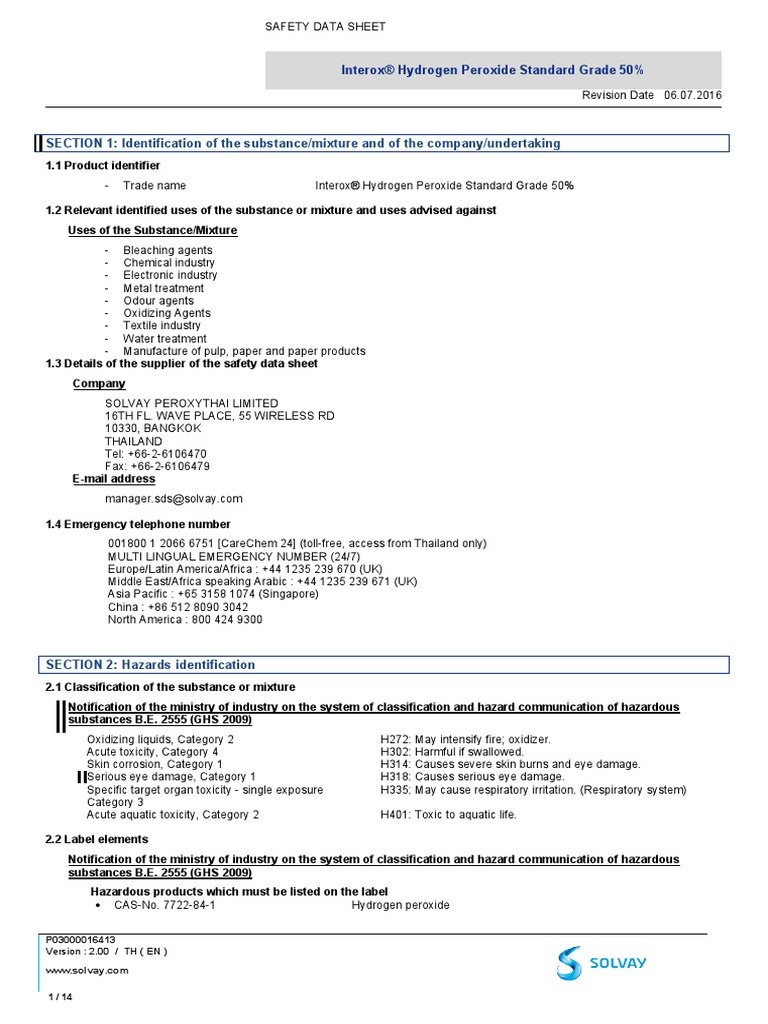 MSDS H2O2 Solvay | PDF | Dangerous Goods | Toxicity