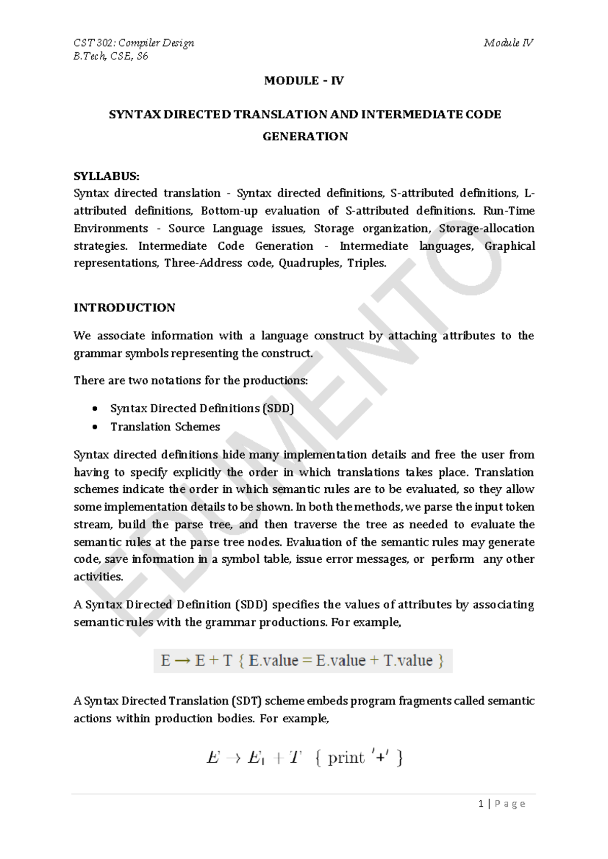 CST 302: Compiler Design B.Tech, CSE, S6 Module IV - Syntax Directed ...