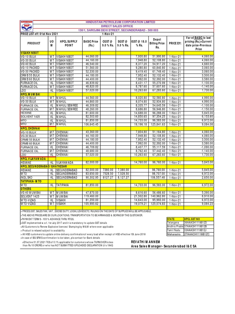 HPCL - PRICE - LIST - EFF-01st Nov 2021 | PDF | Value Added Tax | Trade