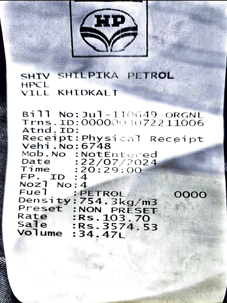 HPCL Petrol Receipt - Khidkali 2024 | PDF