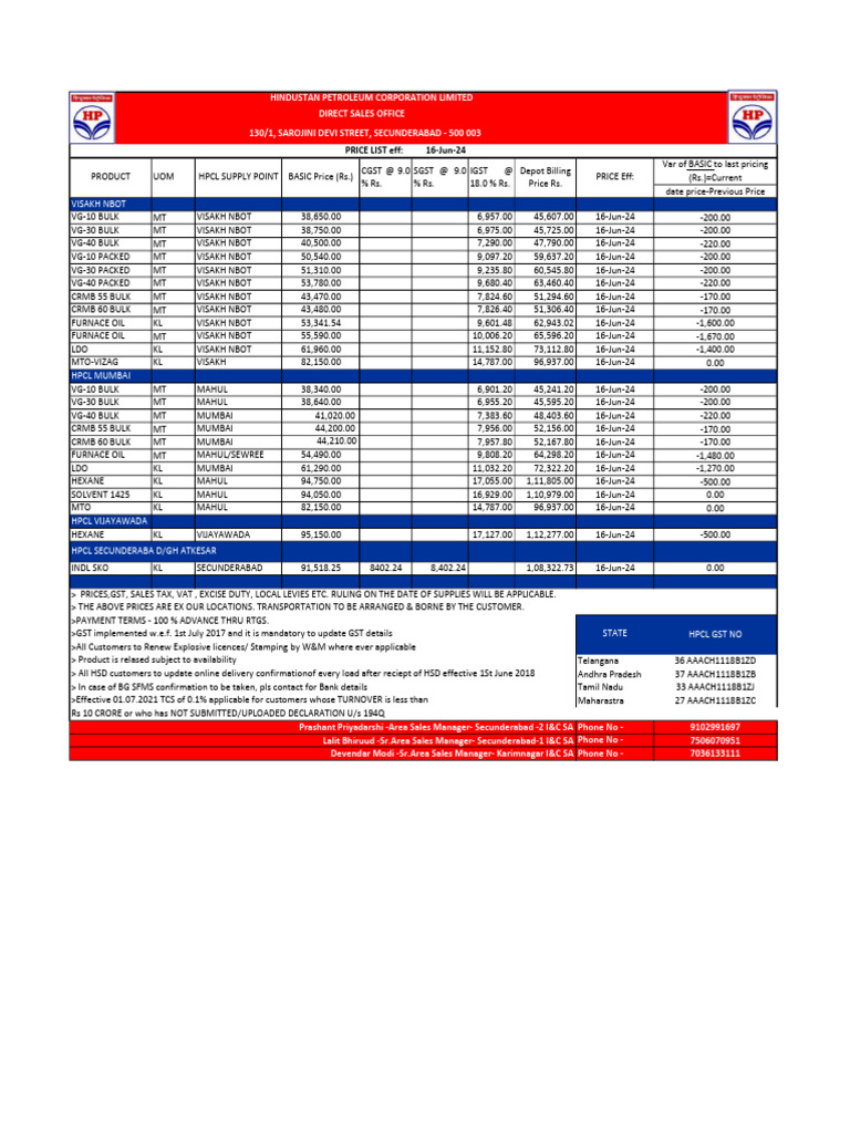 HPCL Price List W.E.F 16.06.24 | PDF | Trade | Payments
