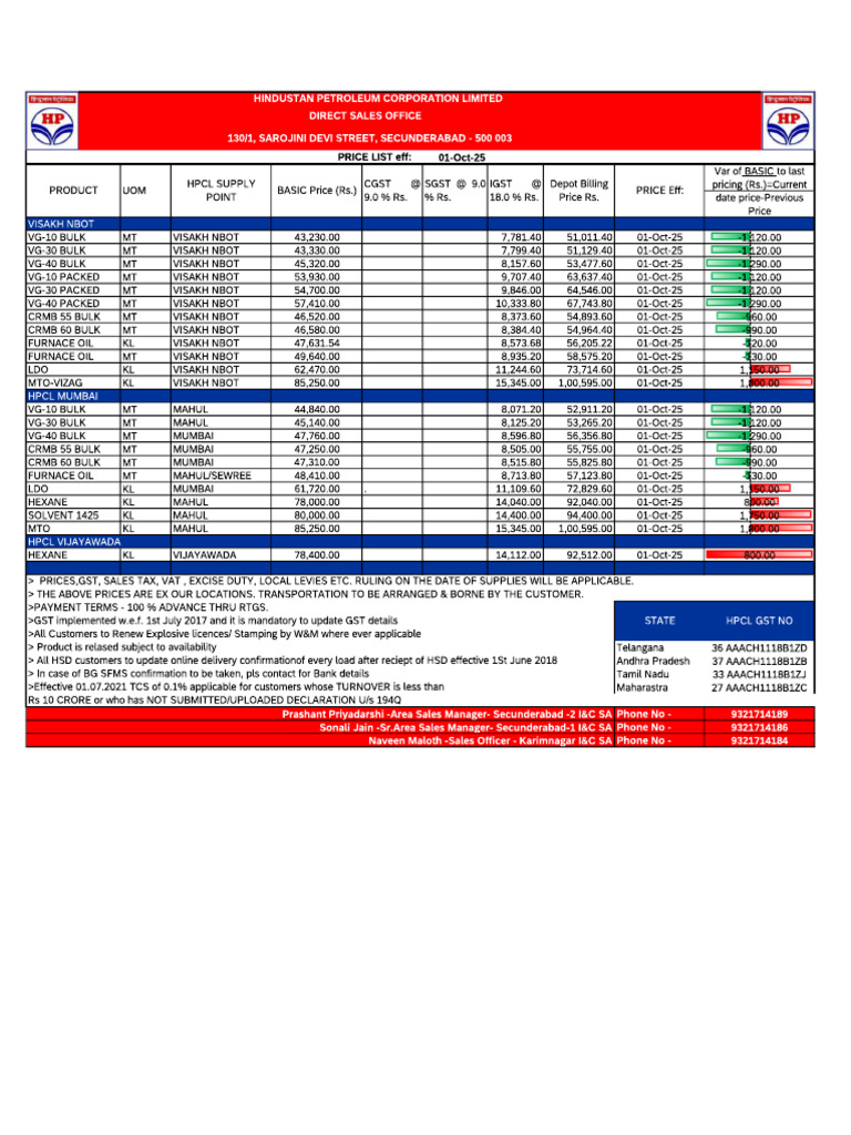 HPCL - Price List - Wef 1 - Oct-25 | PDF