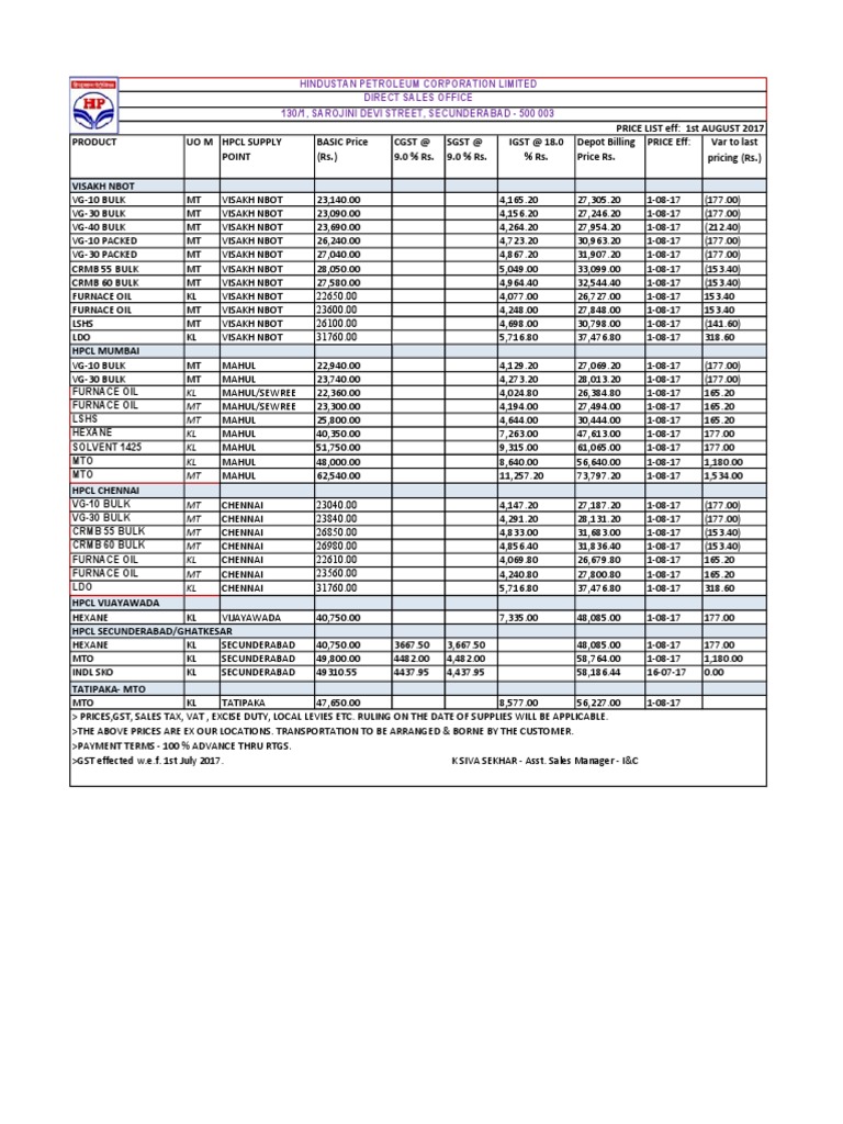 HPCL Price List 010817 PDF | PDF | Value Added Tax | Government Finances