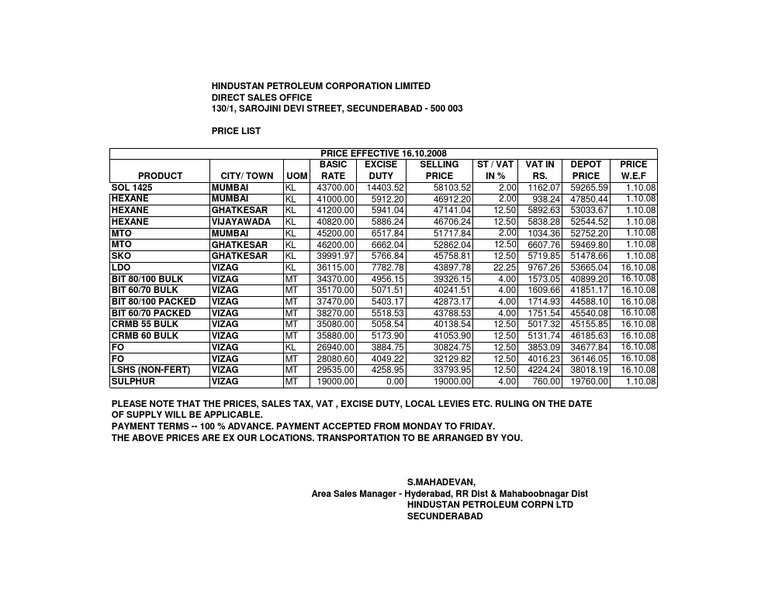 Bitumen HPCL Price List 16-10-08 | PDF | Value Added Tax | Services ...