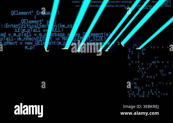 Purple WELCOME text animation over blue programming code on black ...