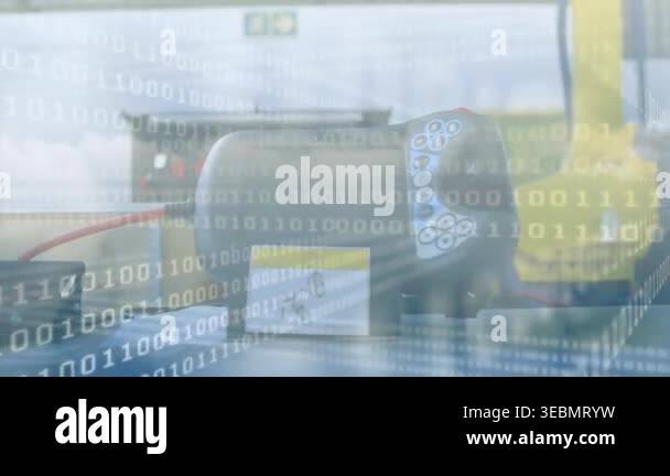 Animation of binary code over technology devices. Robotics, design ...