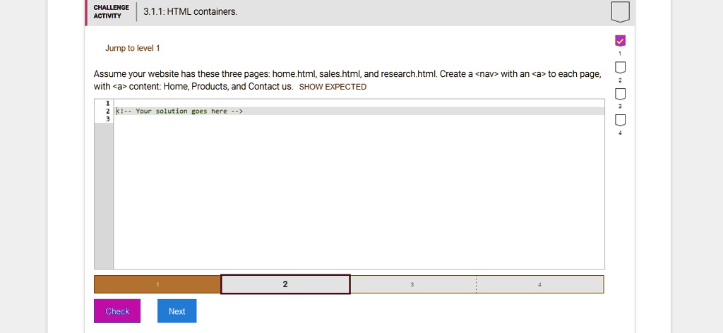 CHALLENGE 3.1.1: HTML containers. ACTIVITY Jump to level 1 Assume your ...