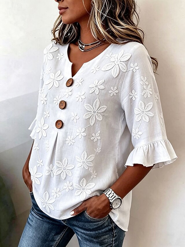 Women's Shirt Blouse Embroidered Buttons Floral Graphic Fashion Casual ...