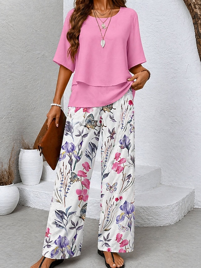 Women's Pants Sets Half Sleeve Butterfly Sleeve Round Neck Floral ...