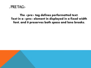 pre tag, hr tag, br tag | Preformatted text | Horizontal rule | Break ...