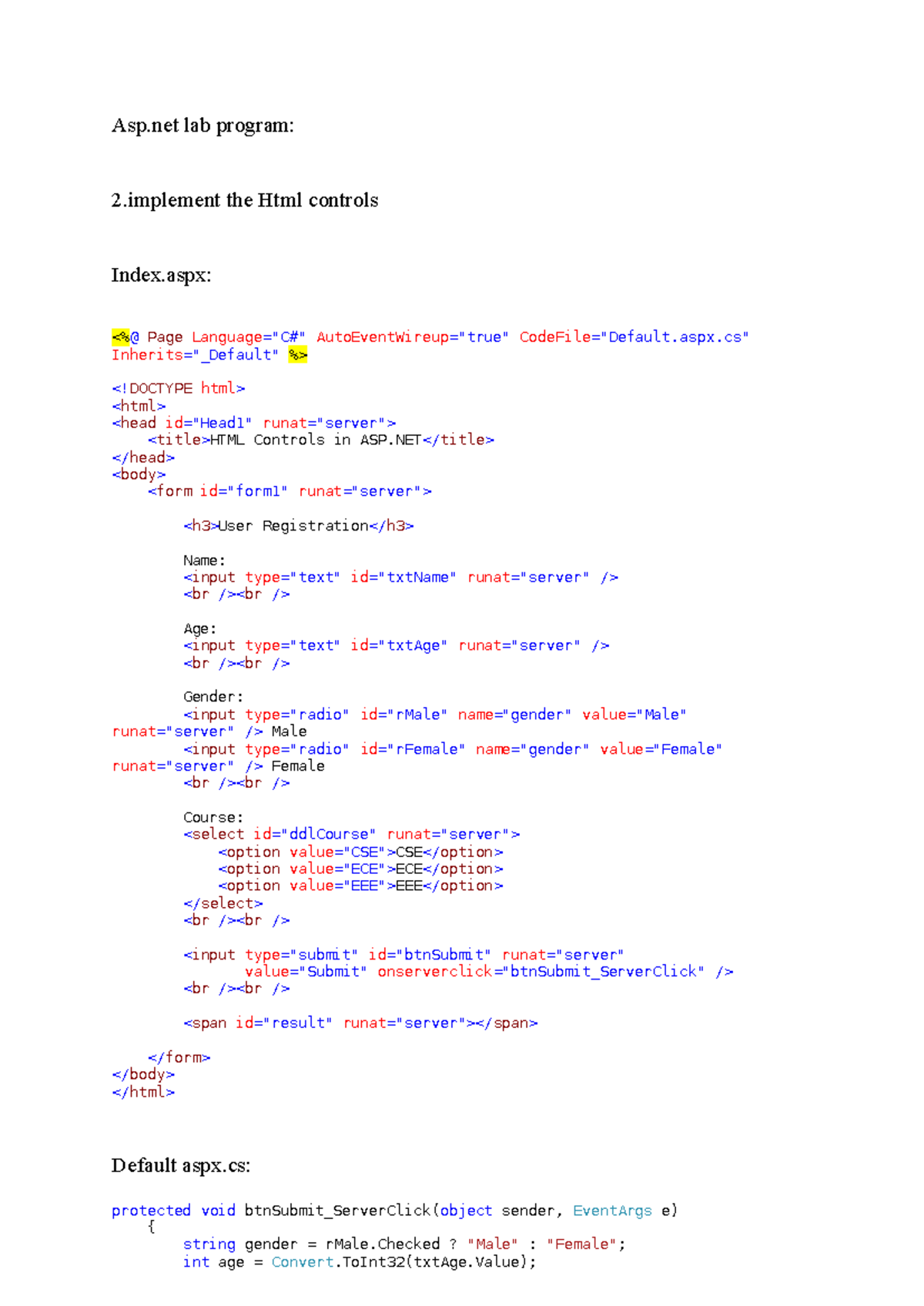ASP.NET Lab Program: Implementing HTML & Server Controls - Studocu