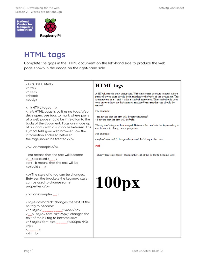 6.6 Worksheet HTML Tags - ICT Unit 2 – Programming, Database & Data ...