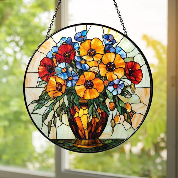 BLESSING DECOR Floral Bouquet Glass Suncatcher, Colorful Flower Vase ...