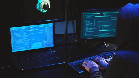 Hacker In Black Mask Using Computer Breaking Stock Footage SBV ...