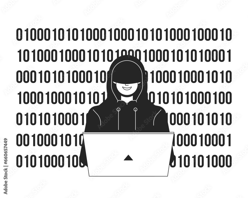 Hacker in hood coding bw concept vector spot illustration. Man with ...