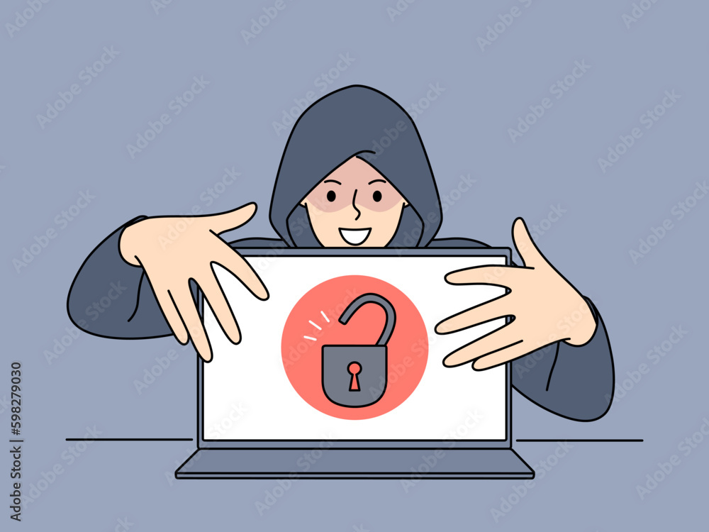Hacker in hood touching open laptop with padlock symbol on screen steal ...