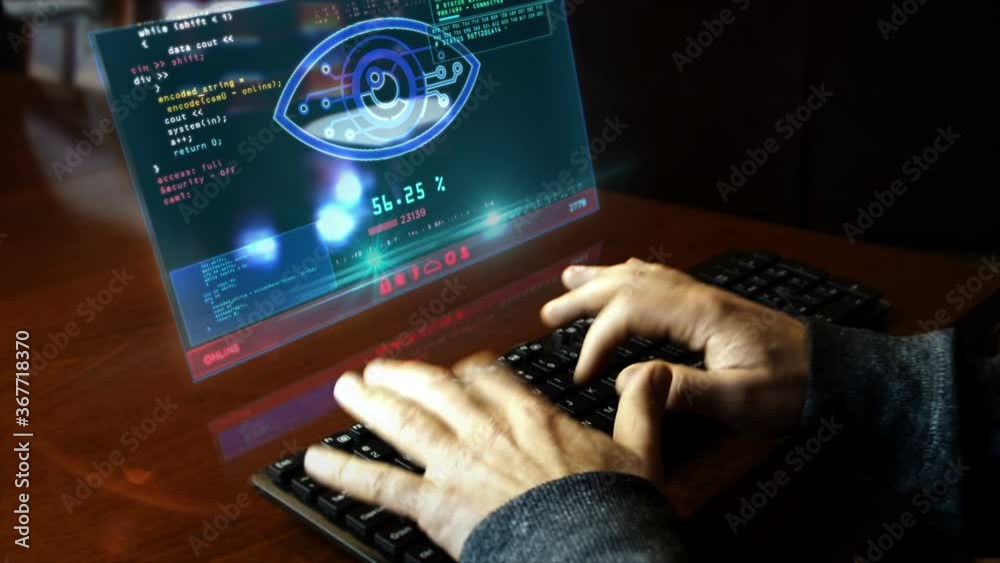 Hacker typing on the keyboard with cyber eye on hologram screen on desk ...