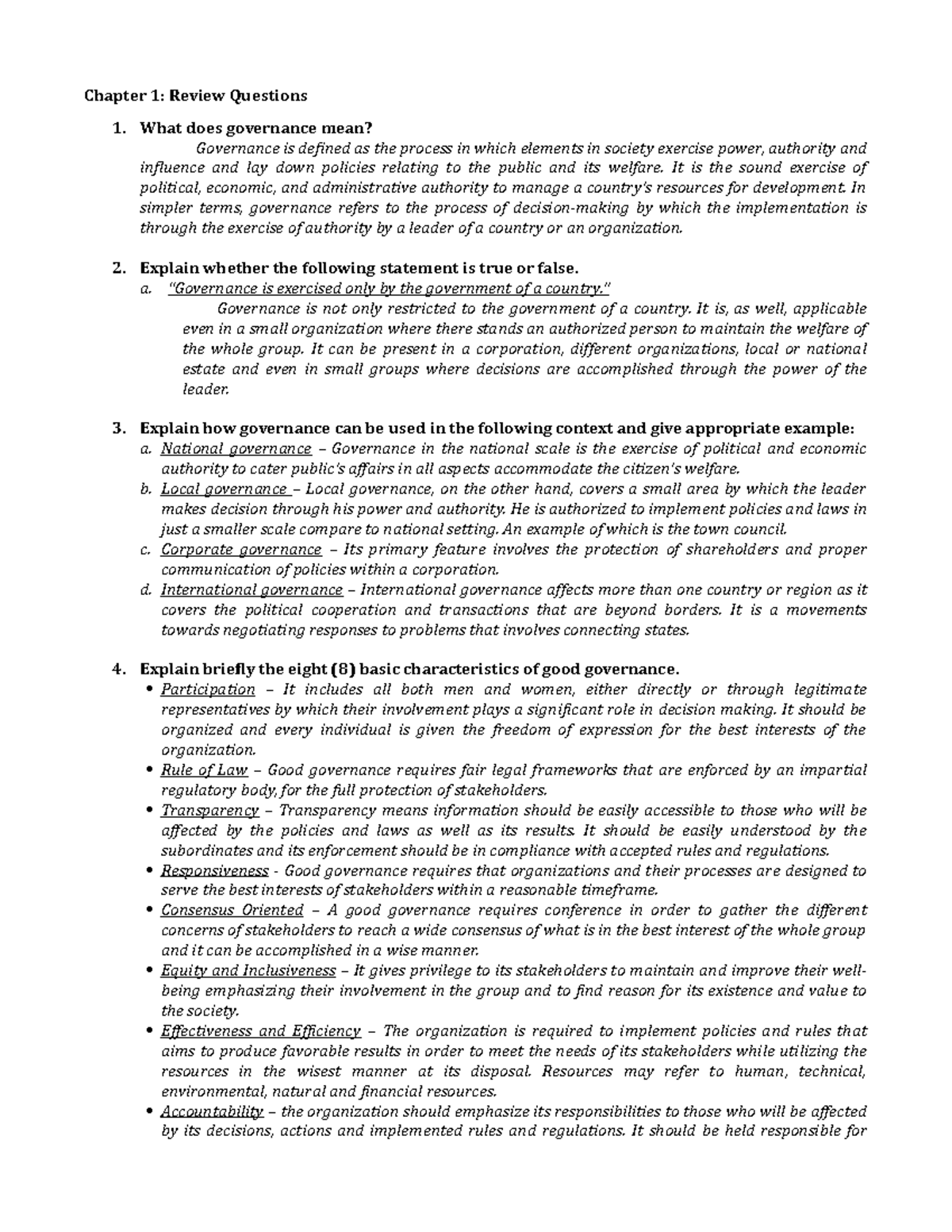 Governance Concepts in Chapter 1-2: Review Questions & Insights - Studocu