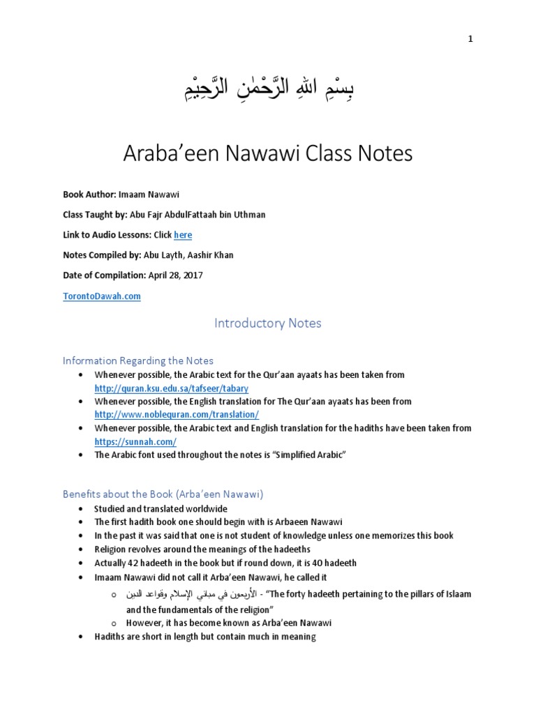 Arba'een Nawawi Class Notes Overview | PDF | Hadith | Quran