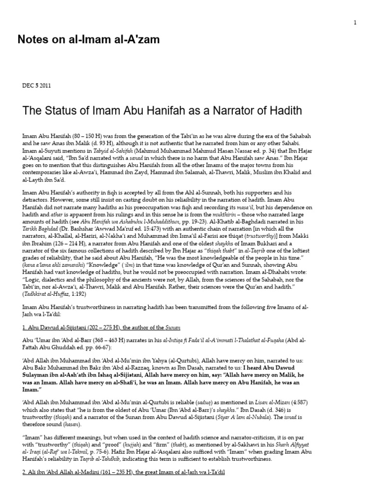 The Status of Imam Abu Hanifah As A Narrator of Hadith Notes On Al-Imam ...