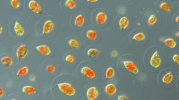 Light microscope footage of Haematococcus pluvialis algae, showing the ...