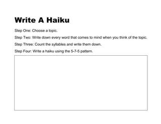 Haiku Remember The Haiku Pattern. 5 - 7 - 5 Task One Example | PDF