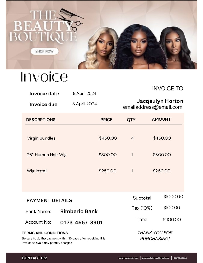 Invoice, Pink Invoice, Hair Business, Beauty, Boutique, Wigs, Clothing ...