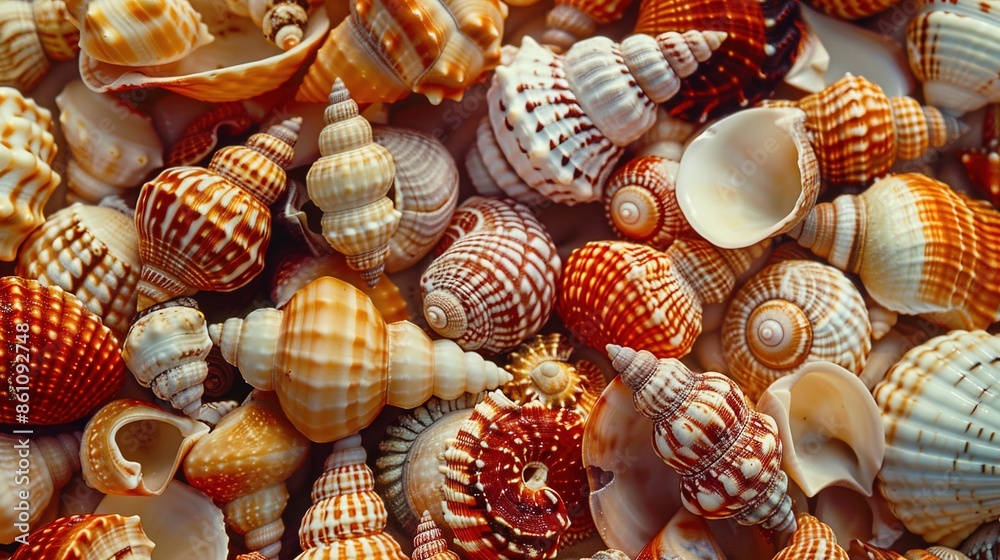 A close-up texture of sea shells, with a variety of shapes, sizes, and ...