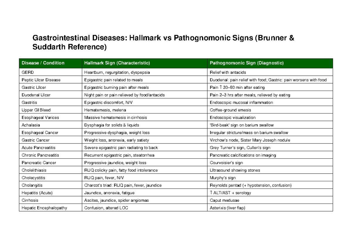 GIT Diseases: Hallmark vs Pathognomonic Signs (Brunner Suddarth) - Studocu