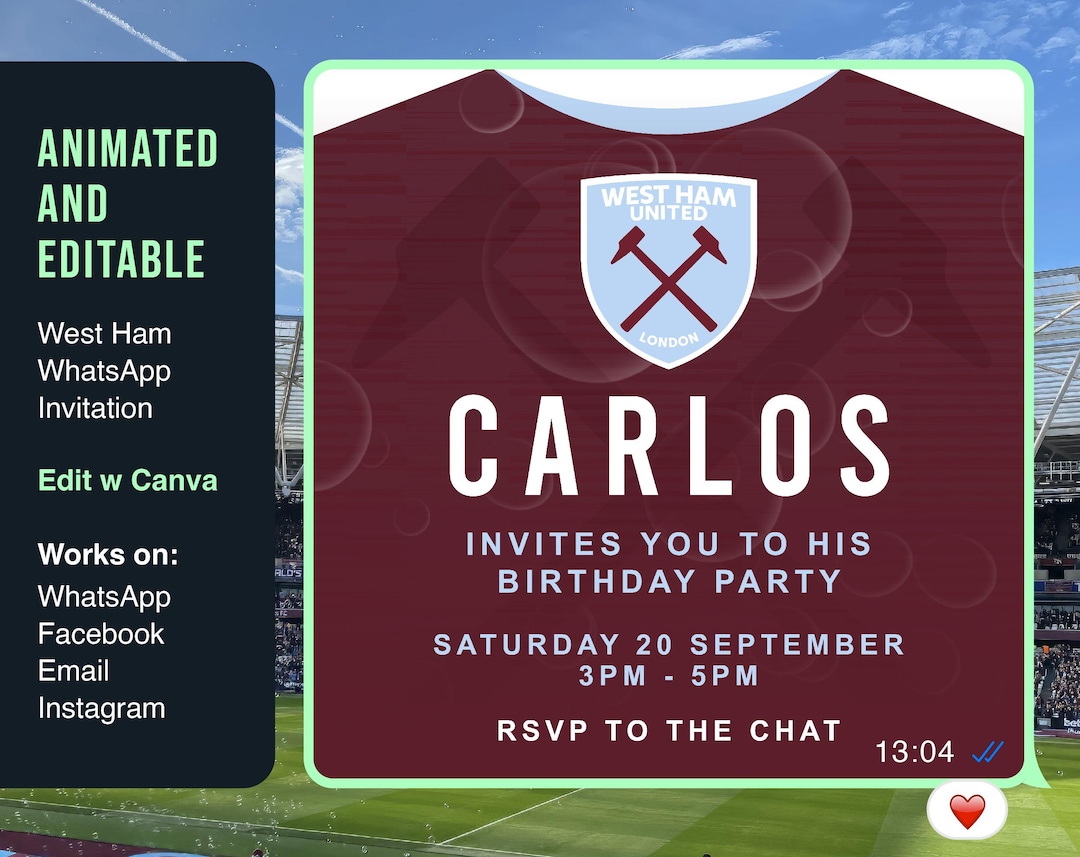 Editable Animated West Ham United Party Invitation, Digital Whatsapp ...