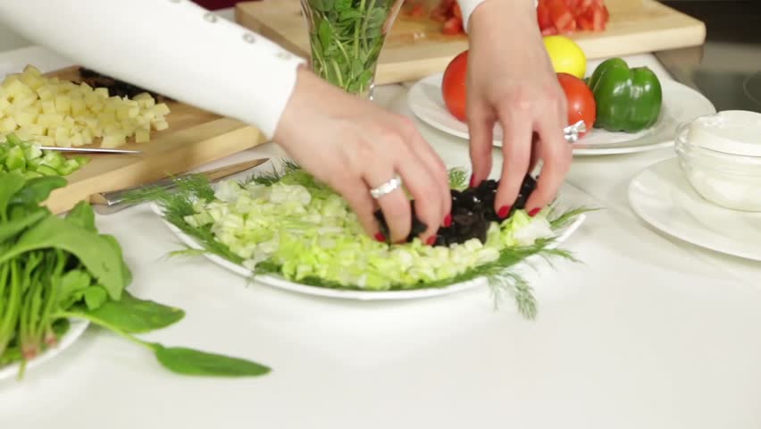 Closeup of human hands cooking vegetables salad in kitchen. Healthy ...