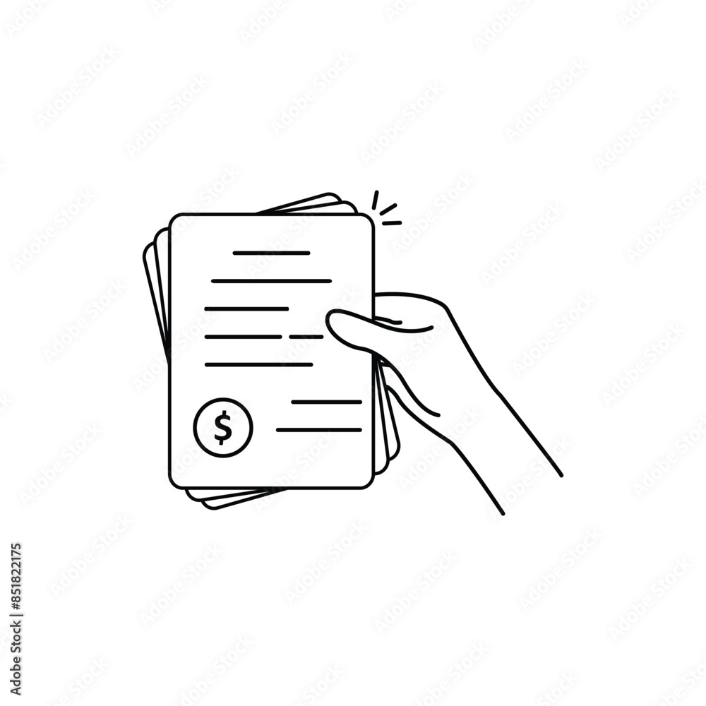 black thin line hand holding invoice. concept of pile of check list ...