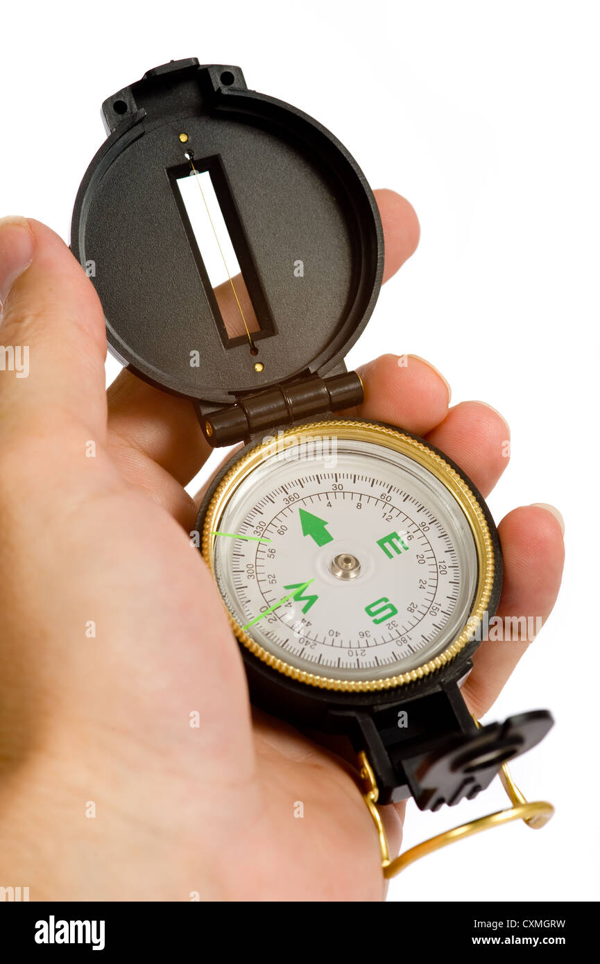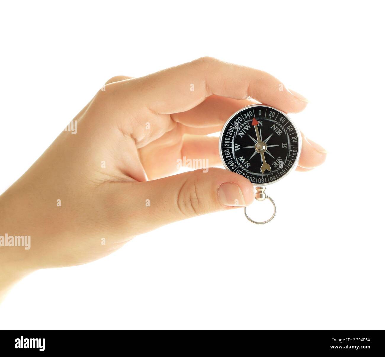 Close-up Of Hand Holding Compass On White Background Stock Photo - Alamy