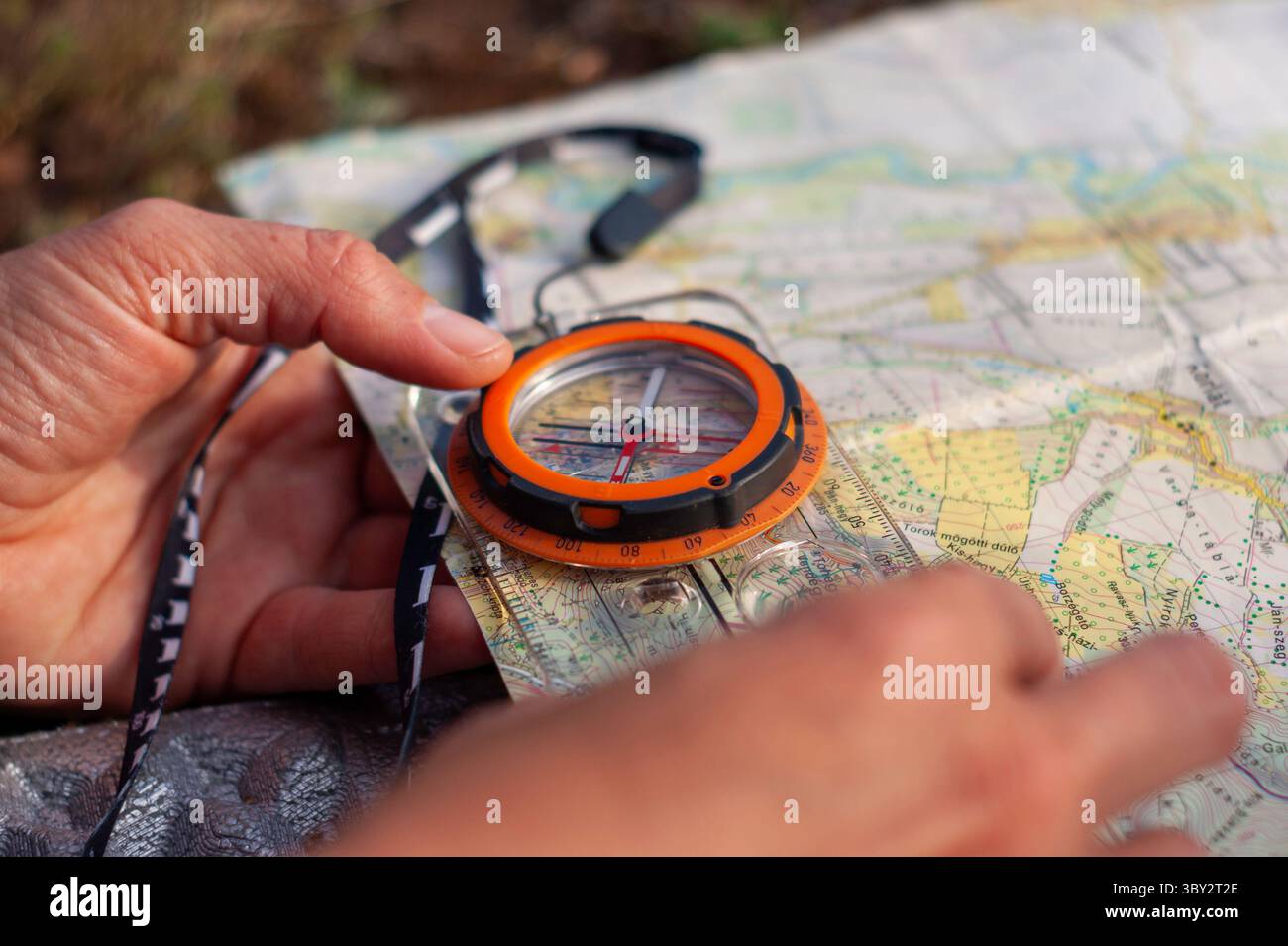 Hands Navigating Using a Compass and Map in an Outdoor Adventure ...