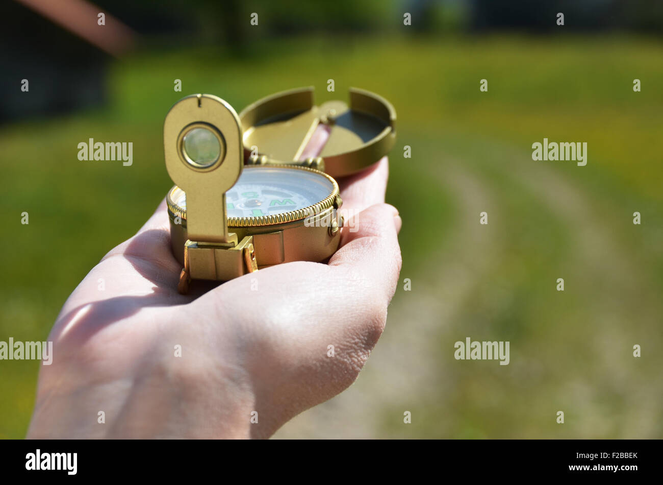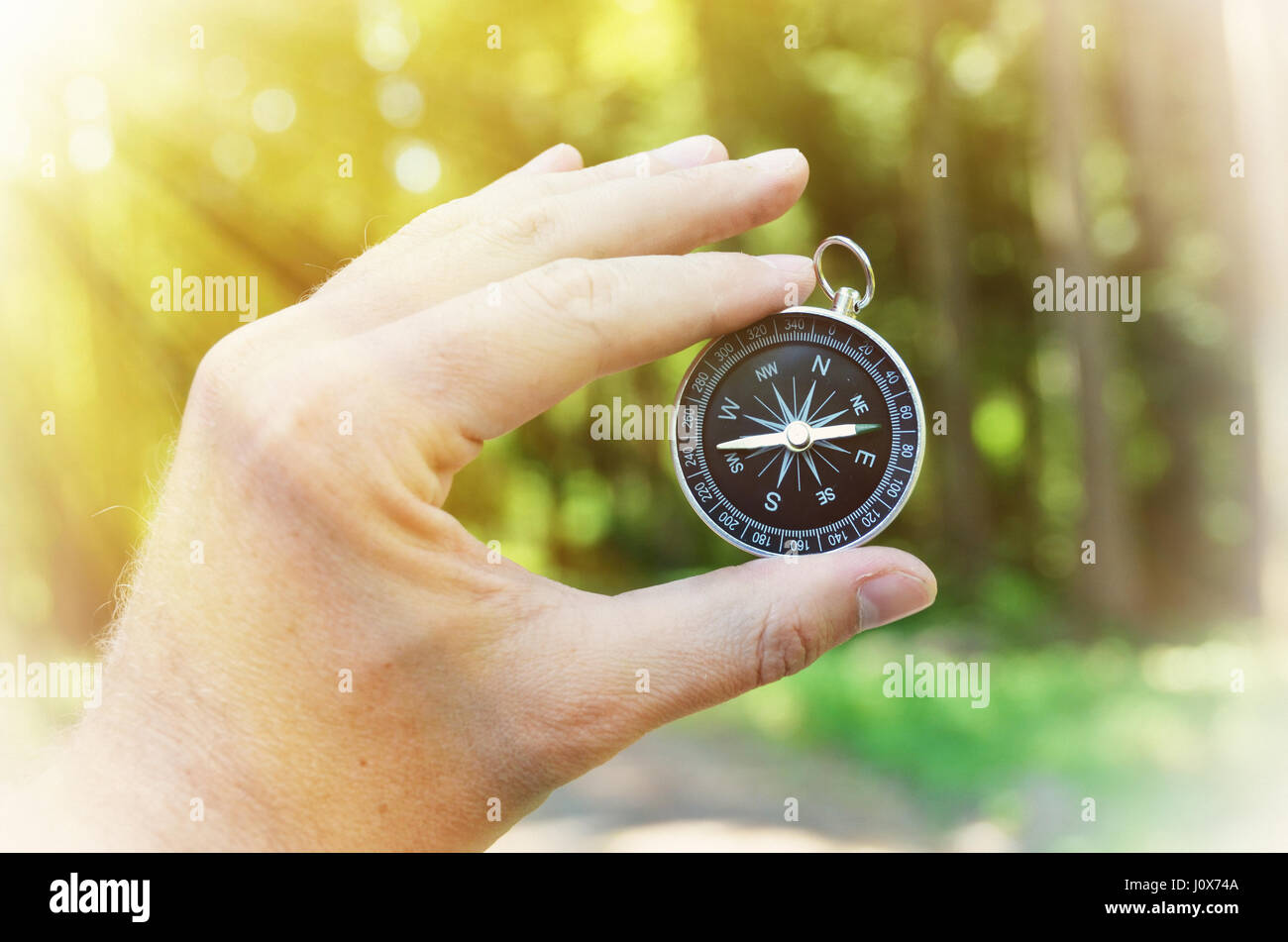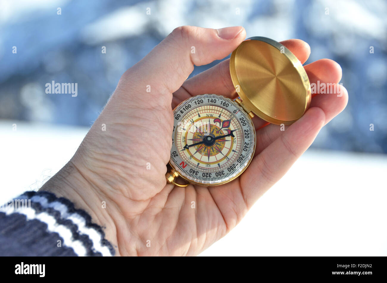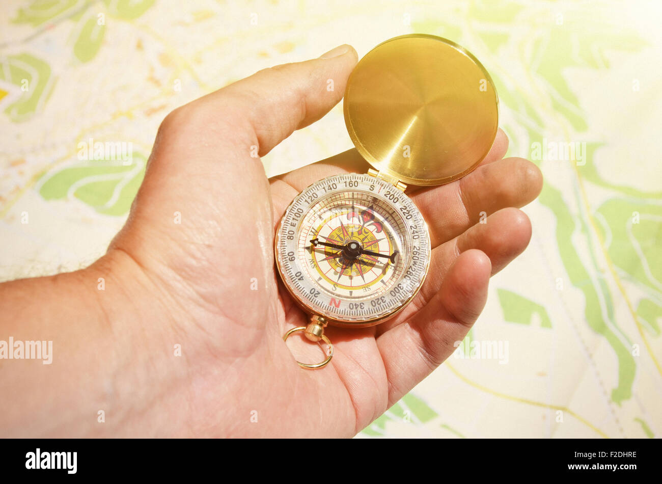 Closeup of a mans hand holding a compass in his hand. Concept for ...