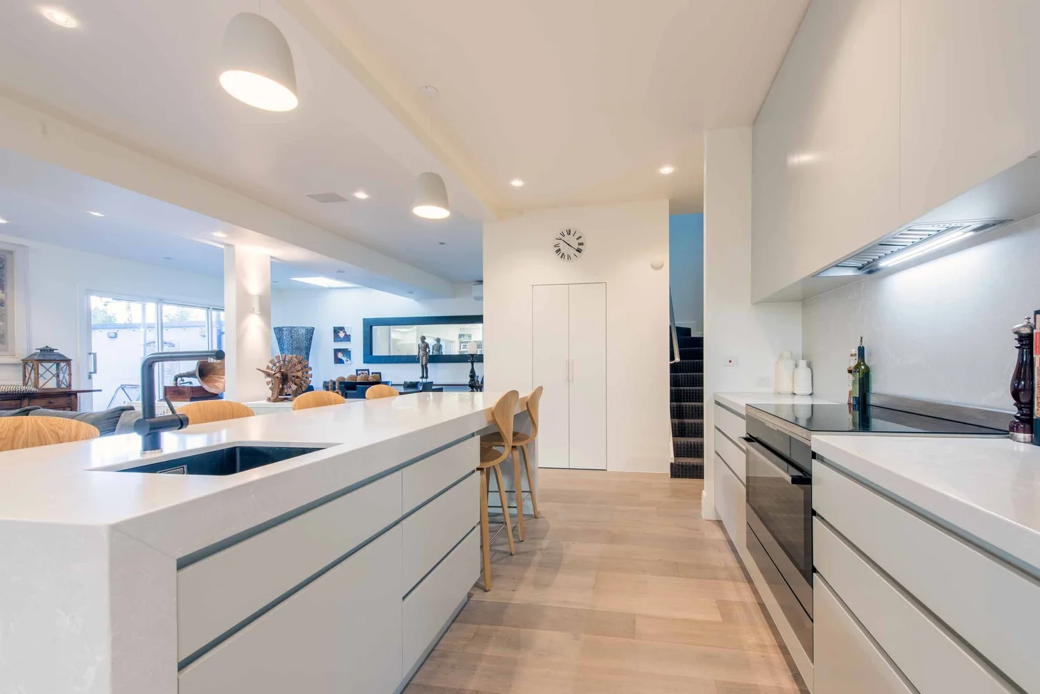 Modern Open Kitchen Design with Handle-less Drawers and Tall Units