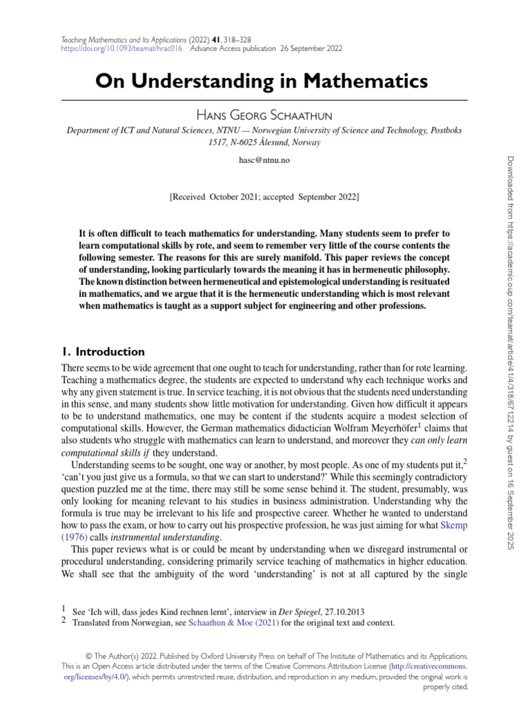 2022-Hans Georg Schaathun-On Understanding in Math Q1 | PDF | Deductive ...