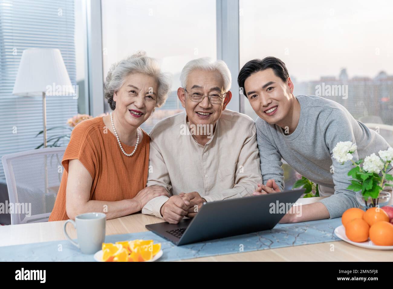 Happy family using laptop together and laughing Stock Photo - Alamy