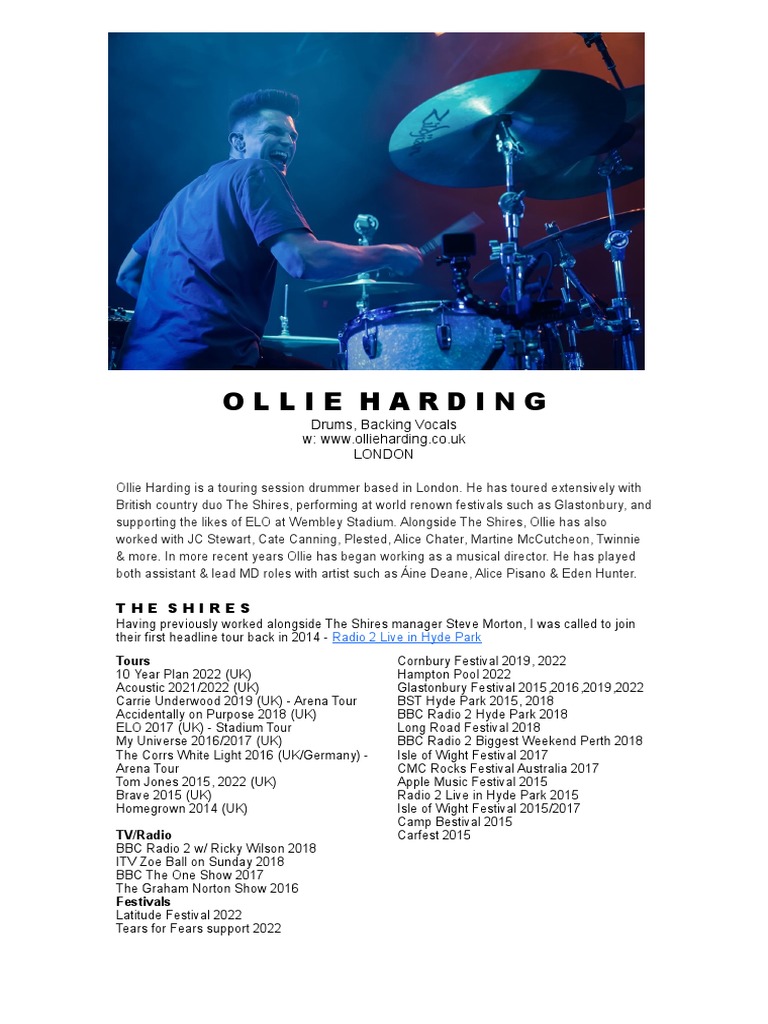 Ollie Harding: Drums, Backing Vocals W: WWW - Ollieharding.co - Uk ...
