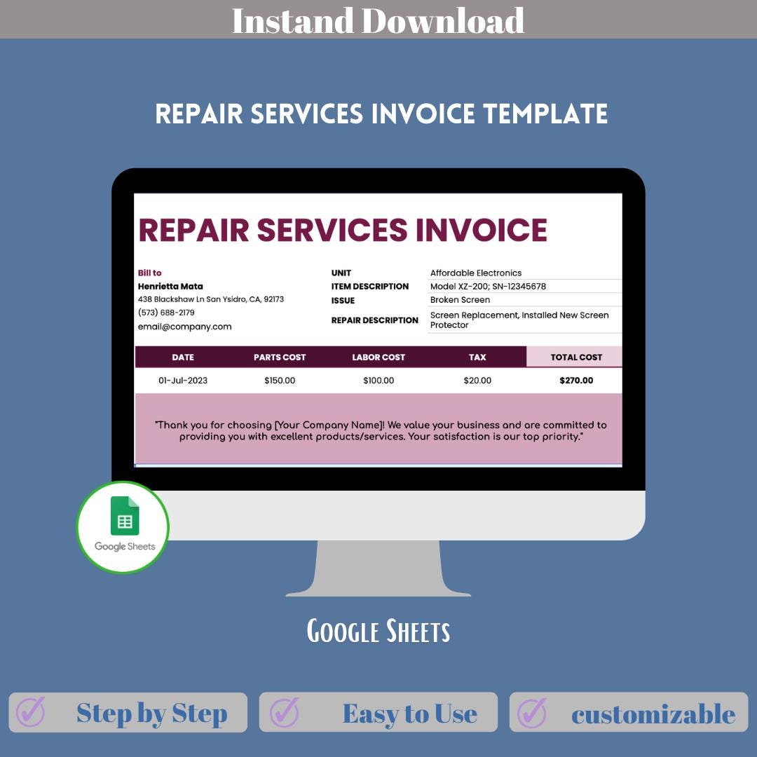 Repair Services Invoice Template, Editable, Google Sheets, Digital ...