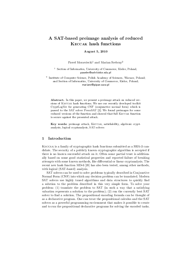 (PDF) A SAT-based preimage analysis of reduced Keccak hash functions