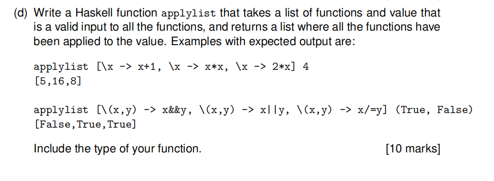 Solved (d) Write a Haskell function applylist that takes a | Chegg.com